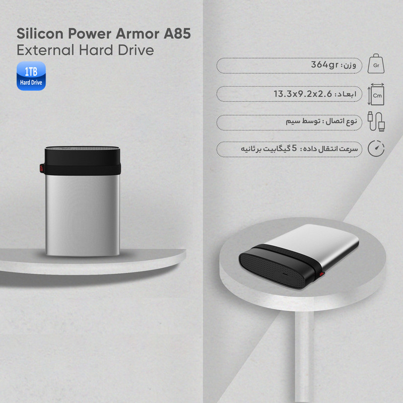 هارد اکسترنال سیلیکون پاور مدل Armor A85 ظرفیت یک ترابایت دارای رابط USB Type-A 3.2