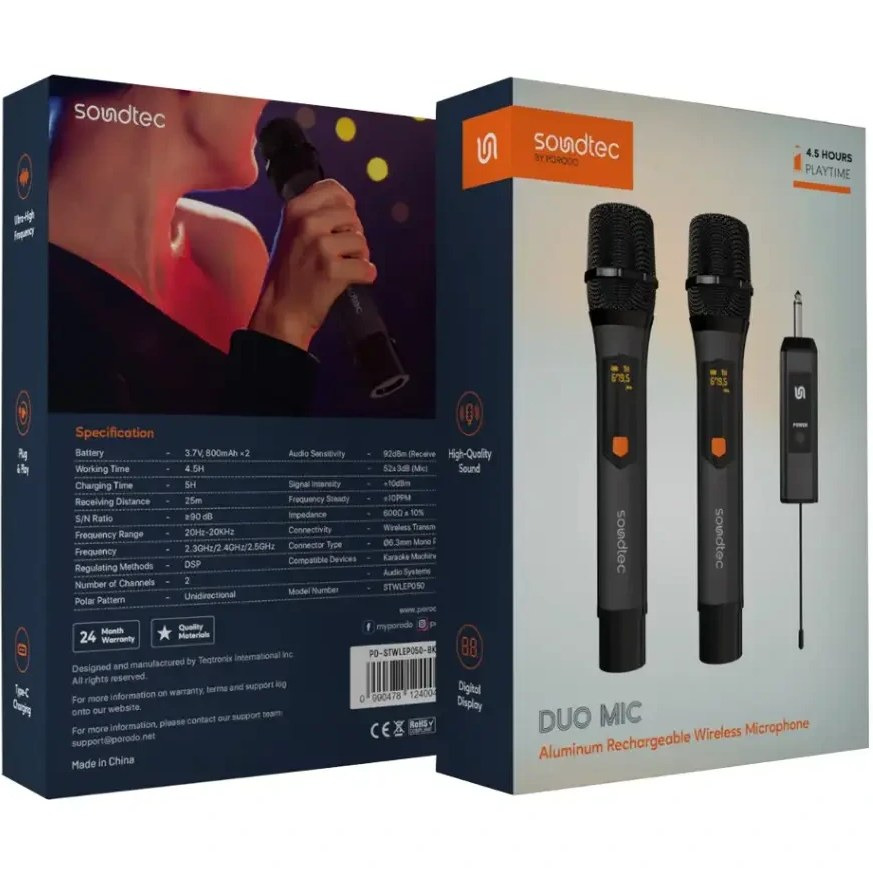 برند : پرودو porodo نوع میکروفن : بیسیم فرکانس پاسخگویی : 2.3GHz/2.4GHz/2.5GHz ظرفیت باتری : 3.7V, 800mAh x2 زمان نگهداری شارژ : 4.5 ساعت مدت زمان شارژ شدن : 5 ساعت نسبت سیگنال به نویز : ≥90 دسیبل ویژگیهای میکروفون حرفهای : شارژ نوع C وصل و اجرا کنید فرکانس فوق العاده بالا نمایشگر دیجیتال صدای با کیفیت بالا